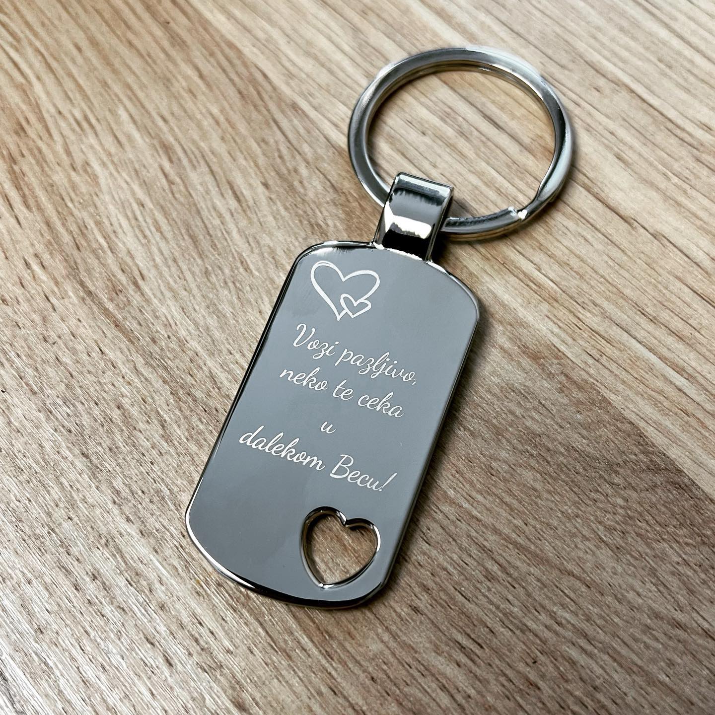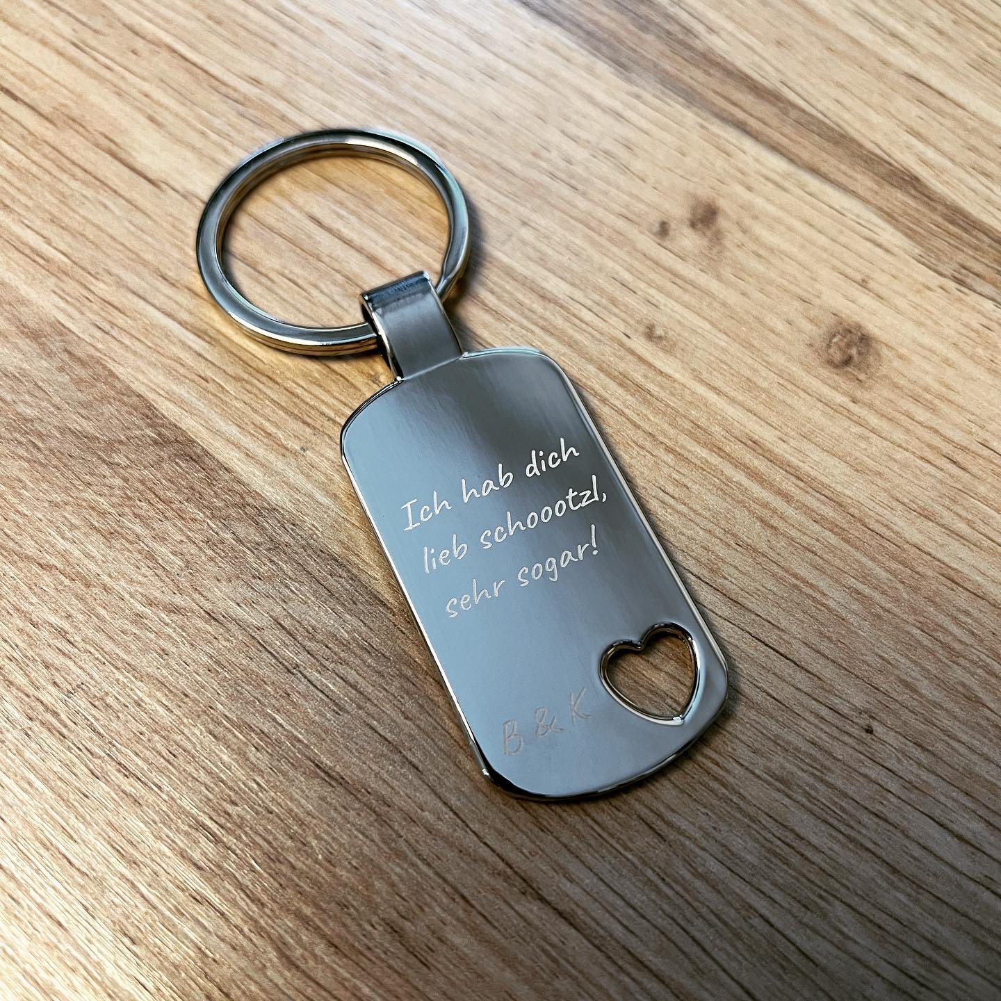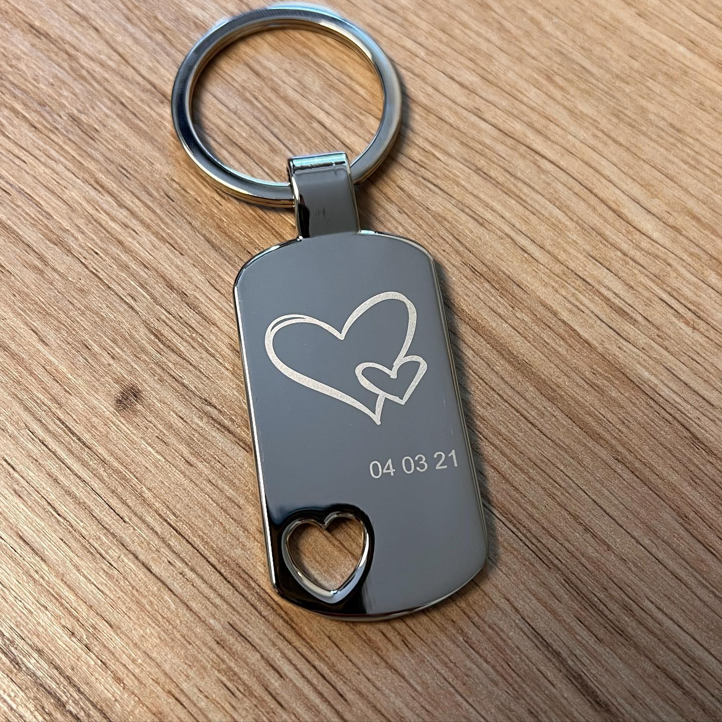 Symbole, Texte und Logos benötigen wir im Vektorformat (SVG-Datei). Keine Farben möglich. Fotos sind auf diesem Anhänger nur bedingt gravierfähig und werden weiß/grau.