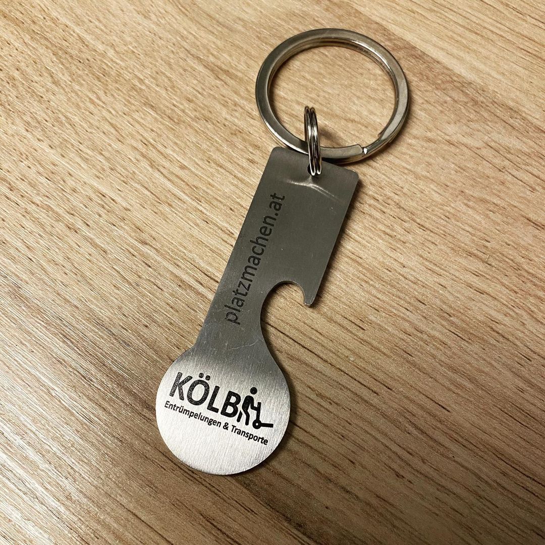 Diesen Schlüsselanhänger kannst du mit deinem Symbol, Logo und Text individuell beidseitig gestalten.