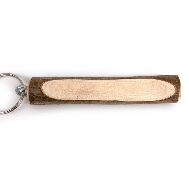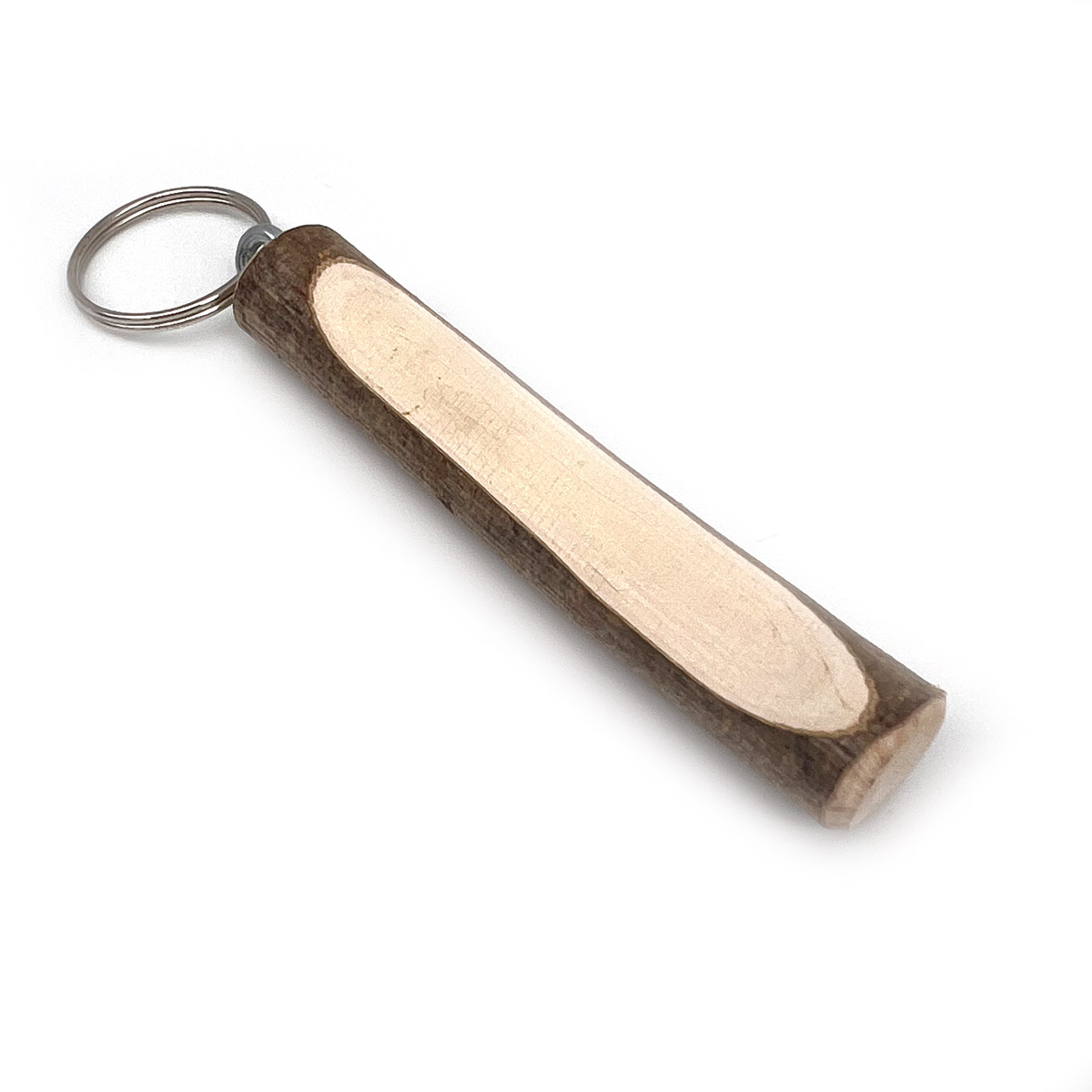 Rindenstämmchen als Schlüsselanhänger aus Haselnussholz.