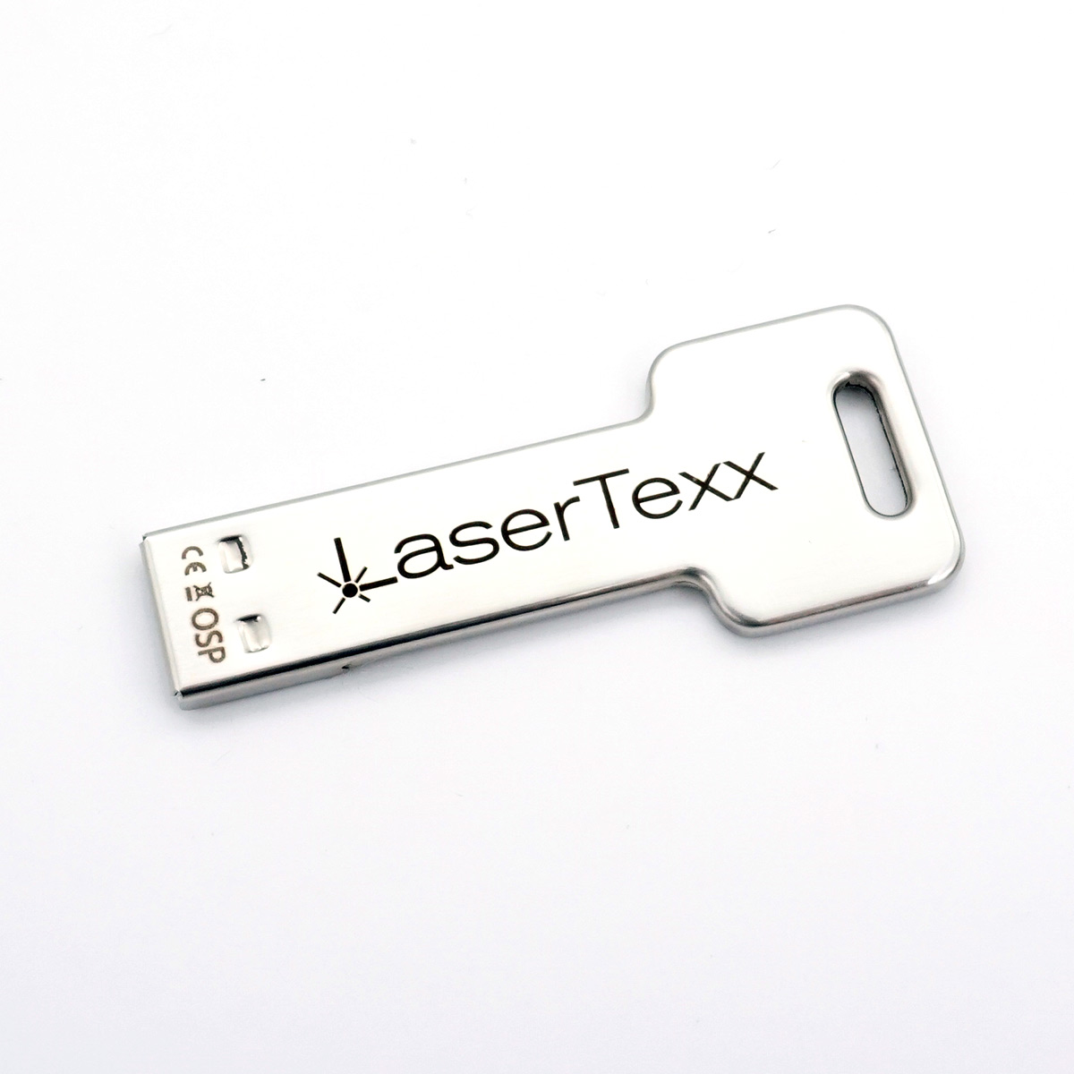 USB-Stick aus Edelstahl in origineller Form. Dank der Öse im Korpus kann der USB-Stick einfach an einem Schlüsselring angebracht werden. In Magnet-Kunststoffbox.